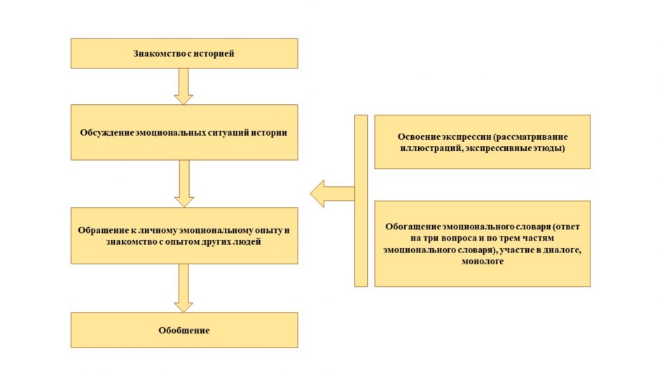 Эта технология показывает последовательность, содержание и назначение этапов проведения занятия. Однако, учитывая конкретные условия, могут быть использованы не все этапы занятия. Некоторые могут быть предложены в свободное время как развлечение или игра, что обогащает образовательное пространство, другие оказаться освоенными ранее. Вместе с тем, теоретические основы понимания эмоций говорят о том, что важно, чтобы все эти компоненты работы интегрировались в опыте ребенка.